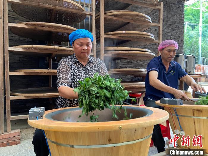 圖為廣西六堡茶制作技藝(自治區(qū)級(jí))非遺傳承人譚愛云(左)正在手工炒制鮮葉。(資料圖)林潔琪 攝