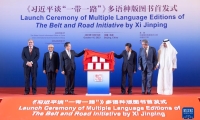 10月16日,《習(xí)近平談“一帶一路”》多語種版圖書首發(fā)式在京舉行,阿拉伯文、西班牙文、葡萄牙文、德文、日文版5種新書正式面向海內(nèi)外出版發(fā)行。這是中外嘉賓代表共同為《習(xí)近平談“一帶一路”》多語種版圖書揭幕。新華社發(fā)(陳建 攝)