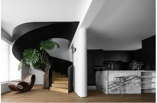 該項(xiàng)目在純粹的元素上疊加軟裝的色彩,讓空間充滿想象力。上下空間通過黑色旋轉(zhuǎn)樓梯的過渡,具有趣味性,打破固定空間內(nèi)原有的沉悶。在滿足功能性的前提下化繁為簡,實(shí)現(xiàn)點(diǎn)對點(diǎn)的最近操作距離,每個(gè)空間相互穿插和連接,既保留了隱私,又增加了互動性,為客戶創(chuàng)造一個(gè)積極的情感環(huán)境。