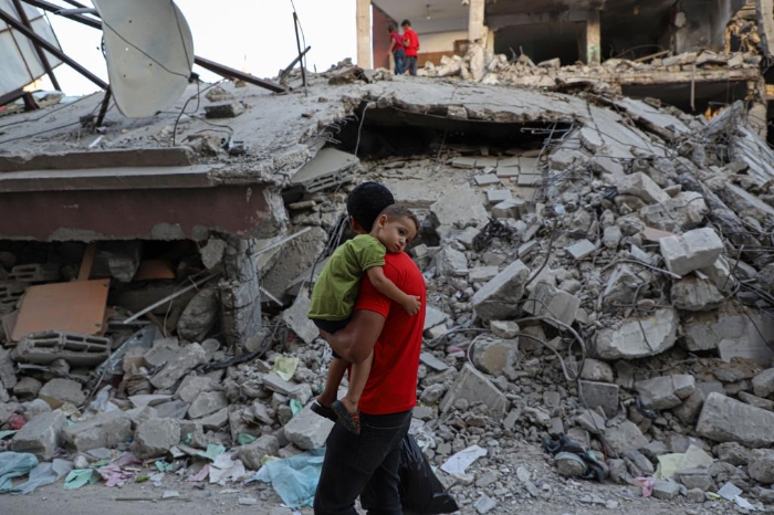 10月16日,在加沙地帶南部城市汗尤尼斯,人們從遭以色列空襲損毀的建筑廢墟前走過(guò)。新華社發(fā)(里澤克·阿卜杜勒賈瓦德攝)