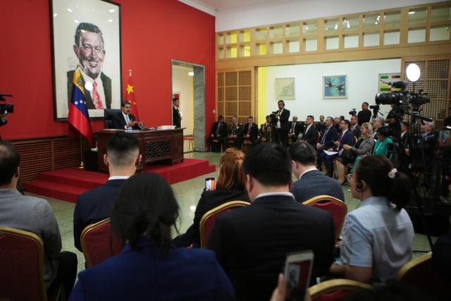 2023年9月14日星期四,委內(nèi)瑞拉總統(tǒng)馬杜羅與其代表團(tuán)中各內(nèi)閣成員在結(jié)束訪華行程前來到委內(nèi)瑞拉駐華大使館召開記者會,向中外媒體介紹其訪華成果并回答記者提問。在記者會上,馬杜羅展示了兩國簽署的關(guān)于建立全天候戰(zhàn)略伙伴關(guān)系的聯(lián)合聲明,并感謝中國幫助委內(nèi)瑞拉應(yīng)對來自美國的無理制裁與打壓,他表示在新冠疫情大流行期間,美國曾經(jīng)阻止別國向委內(nèi)瑞拉運(yùn)送疫苗和物資,這是反人類的犯罪,感謝中國堅(jiān)定的支持,幫助委內(nèi)瑞拉渡過難關(guān)。