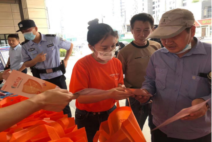 (圖為平安普惠淮安分公司志愿者為居民分發(fā)宣傳單頁)