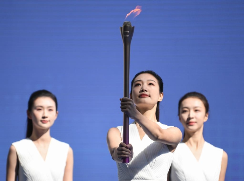 數(shù)字人“弄潮兒”和汪順共同點燃主火炬塔