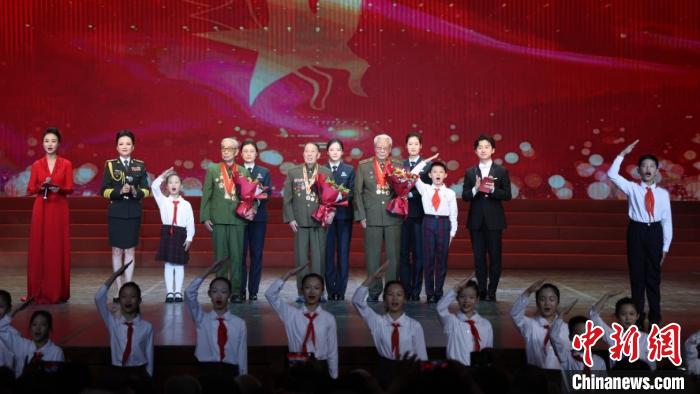 在熱烈的掌聲中,三位親歷抗美援朝戰(zhàn)場(chǎng)烽煙的老戰(zhàn)士來到演出現(xiàn)場(chǎng),70名少先隊(duì)員把鮮花和歌聲獻(xiàn)給老戰(zhàn)士、老同志——《我們是共產(chǎn)主義接班人》的歌聲把專場(chǎng)演出推向高潮。
