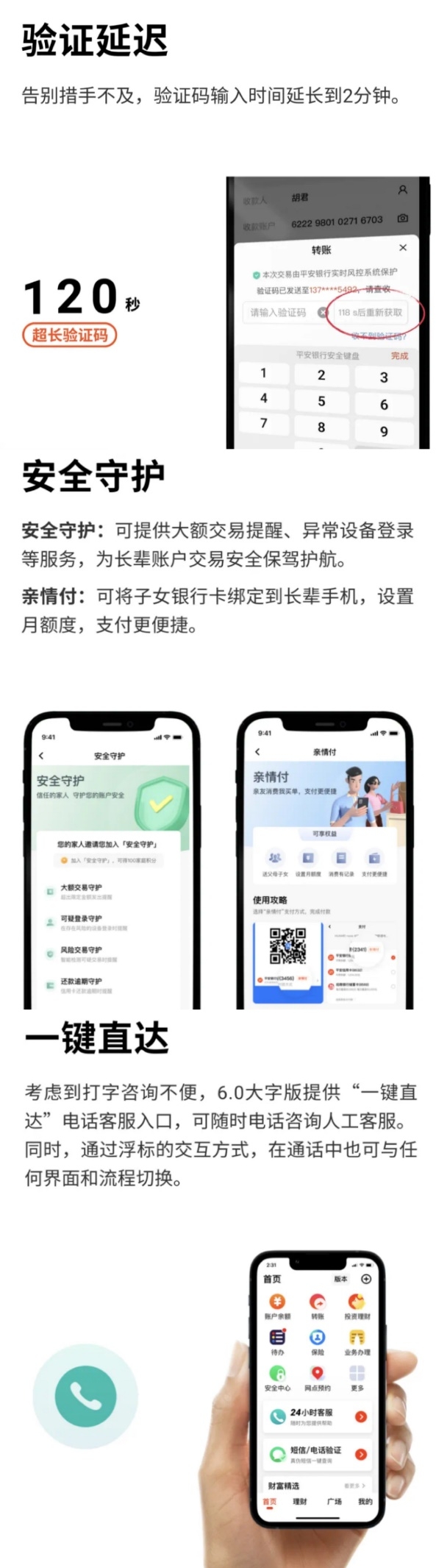 在線上,平安銀行不斷對業(yè)務辦理過程做“簡”法,界面交互簡單、全量屏蔽廣告彈窗、完善的操作指引、以及延長驗證碼有效期等適老化優(yōu)化讓老年朋友能夠輕松在線上完成業(yè)務。同時,60歲以上的用戶撥打95511服務熱線,可智能跳過“復雜”的交互環(huán)節(jié),一鍵接通人工客服。