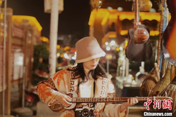 在新疆莎車縣的夜市里,何泓姍體驗了新疆傳統(tǒng)民族樂器。(受訪者供圖)