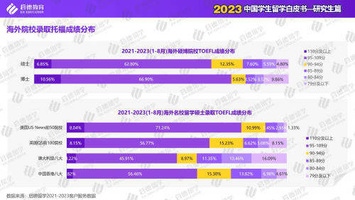 海外名校研究生錄取標(biāo)準(zhǔn)各異。2023年10月14日,啟德教育在北京發(fā)布《2023中國學(xué)生留學(xué)白皮書-研究生篇》,啟德留學(xué)調(diào)研數(shù)據(jù)顯示,“語言成績(jī)達(dá)不到目標(biāo)院校要求”(62.6%)、“GPA達(dá)不到目標(biāo)院校要求”(48.4%)、“國內(nèi)院校背景不夠突出”(39.8%)是學(xué)生在留學(xué)申請(qǐng)期最擔(dān)心的三大問題,“綜合排名”、“教學(xué)質(zhì)量”、“國內(nèi)知名度”是學(xué)生選擇留學(xué)院校的主要參考因素。2021-2023啟德留學(xué)客戶服務(wù)數(shù)據(jù)顯示,雅思成績(jī)方面,海外院校的博士錄取學(xué)生,雅思成績(jī)?cè)?.5分及以上的占比(66.52%)略高于碩士錄取學(xué)生(56.34%)。美國US News前50院校與法國高商名校的碩士錄取學(xué)生,雅思6.5分及以上的占比達(dá)到了九成以上。托福成績(jī)方面,海外院校的博士錄取學(xué)生,托福成績(jī)?cè)?5分及以上的占比(77.46%)略高于碩士錄取學(xué)生(69.65%)。美國US News前50院校的近八成碩士錄取學(xué)生,托福成績(jī)?cè)?5分及以上。