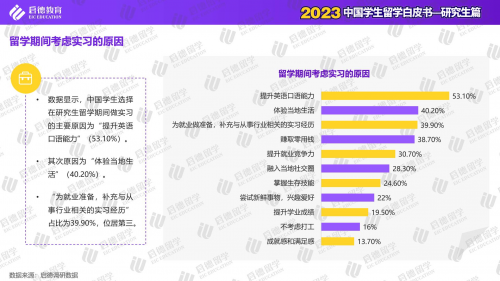 留學(xué)生普遍重視實(shí)習(xí)經(jīng)驗(yàn),AI、新能源與新材料成為就業(yè)新賽道。啟德留學(xué)調(diào)研數(shù)據(jù)顯示,七成以上的中國留學(xué)生在研究生留學(xué)期間考慮在當(dāng)?shù)貙?shí)習(xí),主要實(shí)習(xí)形式包括“嘗試在當(dāng)?shù)仄髽I(yè)找尋實(shí)習(xí)崗位”(34.5%)、“嘗試拍攝vlog做自媒體博主”(29.9%)、“嘗試遠(yuǎn)程PTA等項(xiàng)目”(28.1%)。實(shí)習(xí)的主要原因?yàn)椤疤嵘⒄Z口語能力”(53.1%)、“體驗(yàn)當(dāng)?shù)厣睢保?0.2%)、“為就業(yè)準(zhǔn)備、補(bǔ)充與從事行業(yè)相關(guān)的實(shí)習(xí)經(jīng)歷”(39.9%)。在碩士畢業(yè)后的規(guī)劃中,31.93%的學(xué)生選擇“同時(shí)應(yīng)聘國內(nèi)和海外的工作”,選擇“回國求職”與“海外求職”的占比分別為21.77%與12.93%,另有13.55%的學(xué)生選擇繼續(xù)深造。