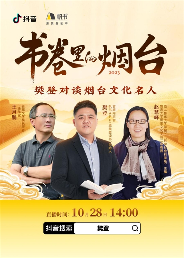 10月28日下午14點(diǎn)在煙臺(tái)博物館,樊登將于其個(gè)人抖音直播間,與來(lái)自山東煙臺(tái)的百花文學(xué)獎(jiǎng)獲得者、一級(jí)作家王月鵬,魯東大學(xué)歷史文化學(xué)院教授趙慧峰,圍坐共讀,聚焦“東方神話之都”,暢談八仙文化。