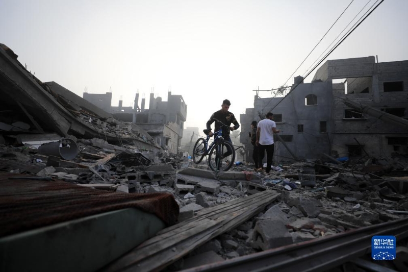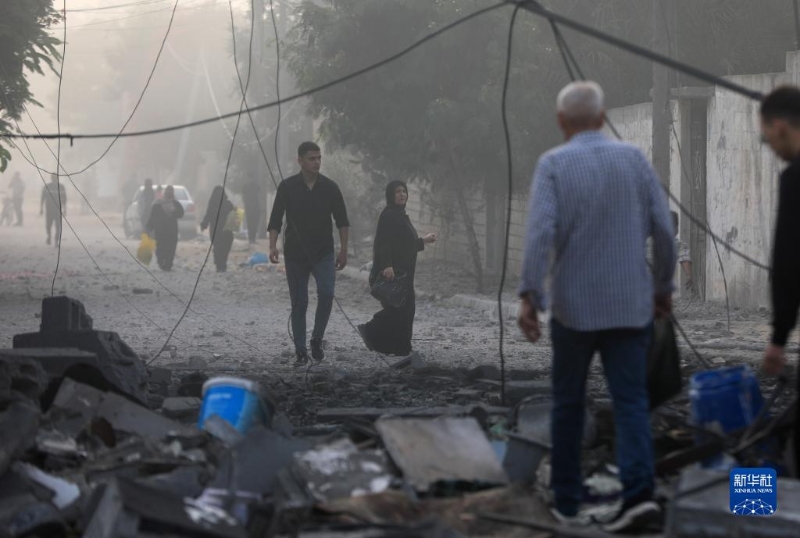 10月25日,在加沙地帶南部城市汗尤尼斯,人們穿過(guò)遍布建筑瓦礫的道路。