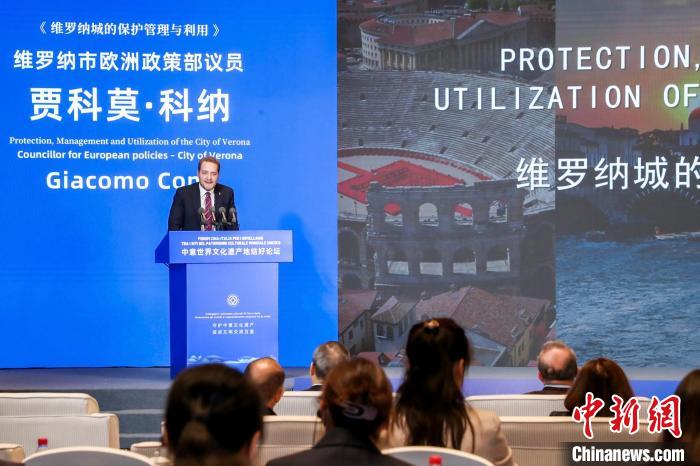10月24日,維羅納市歐洲政策部議員賈科莫·科納在“中意世界文化遺產(chǎn)地結(jié)好論壇”現(xiàn)場發(fā)言。(主辦方 供圖)