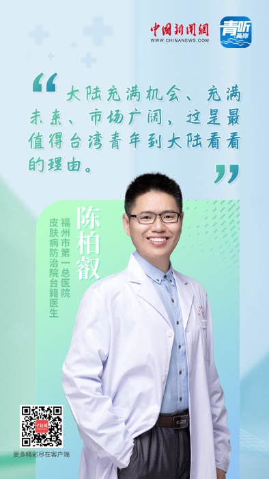 福州市第一總醫(yī)院皮膚病防治院臺(tái)籍醫(yī)生陳柏叡與丁文蘊(yùn)同年“登陸”,他是福州市首位事業(yè)單位聘用的具有研究生學(xué)歷的臺(tái)胞,“我能夠進(jìn)入到編制內(nèi),其實(shí)對(duì)于我的職業(yè)發(fā)展幫助非常大,可以一步一個(gè)腳印往上走,去發(fā)展自己的專業(yè)”。