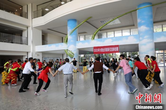 交流團26日來到臺北市立大學(xué),大陸社會體育指導(dǎo)員展示了太極扇、彩帶龍、花式跳繩等健身項目,臺北市立大學(xué)學(xué)生表演了扯鈴、霹靂舞、特技舞蹈等,大家還一起跳起鍋莊舞。
