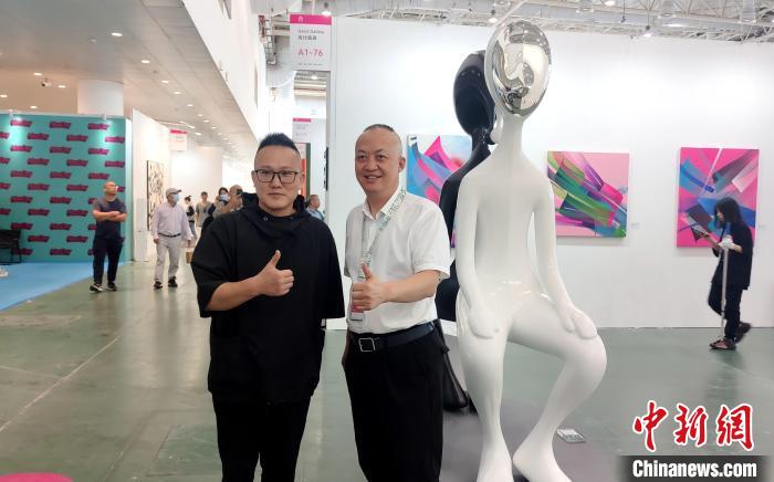 藝術(shù)廈門(mén)博覽會(huì)組委會(huì)主任羅文軒(右)與藝術(shù)家蘇武在《wake up覺(jué)》作品前合影。中新網(wǎng)記者 楊伏山 攝
