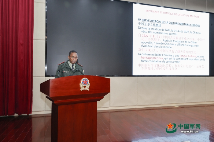活動中,軍事文化學(xué)院的程倩、陳曦2位教授和學(xué)員代表李詩陽分別進(jìn)行主題發(fā)言,國際防務(wù)學(xué)院英語班孟加拉籍學(xué)員馬吉布、阿根廷籍學(xué)員賽爾吉奧,法語班科特迪瓦籍學(xué)員科南、突尼斯籍學(xué)員斯克里、馬達(dá)加斯加籍學(xué)員魯?shù)婪颍謩e介紹了其所在國家軍事文化建設(shè)相關(guān)情況。