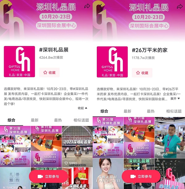 在內(nèi)容場景上,抖音電商聯(lián)合深圳禮品展打造#深圳禮品展、#26萬平米的家 兩個話題,以熱點話題聚合達人、商家打卡深圳禮品展,在短時間內(nèi)持續(xù)產(chǎn)出展會相關(guān)的優(yōu)質(zhì)內(nèi)容,全方位放大活動聲量,喚醒用戶潛在的消費興趣,促進品牌實現(xiàn)生意聲量和銷量的雙豐收。截止到目前,#深圳禮品展播放量超4264.8W,#26萬平米的家播放量超1178.7W。