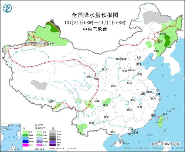 10月30日08時(shí)至31日08時(shí),新疆阿勒泰地區(qū)、內(nèi)蒙古東北部、西藏東部、川西高原南部等地部分地區(qū)有小到中雪,其中,新疆阿勒泰北部、內(nèi)蒙古東北部等地局部地區(qū)有大雪或暴雪(10~15毫米)。黑龍江東南部、吉林中東部、遼寧東部、四川東南部、云南南部、海南島、臺(tái)灣島等地部分地區(qū)有小雨。新疆南部、甘肅西部、內(nèi)蒙古、西藏中西部等地部分地區(qū)有4~6級(jí)風(fēng),其中,內(nèi)蒙古中部、西藏北部等地部分地區(qū)有6~7級(jí)風(fēng)。