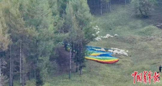 一眼望去,山坡上森林中央的草叢呈現(xiàn)一片“海洋”,“海洋”由高低不一的木樁制成,上有綠、黃、白、紅、藍等多種顏色,微風吹過,樹木搖曳,蜿蜒曲折的木樁呈現(xiàn)“動態(tài)”。這個名為《層林疊浪》的作品是孔繁迪與9位村民在山坡上耗時20天完成的?!拔蚁M闷卟实暮@祟A示西口村的村民們能夠過上五彩斑斕的生活?!笨追钡细嬖V中青報·中青網(wǎng)記者。