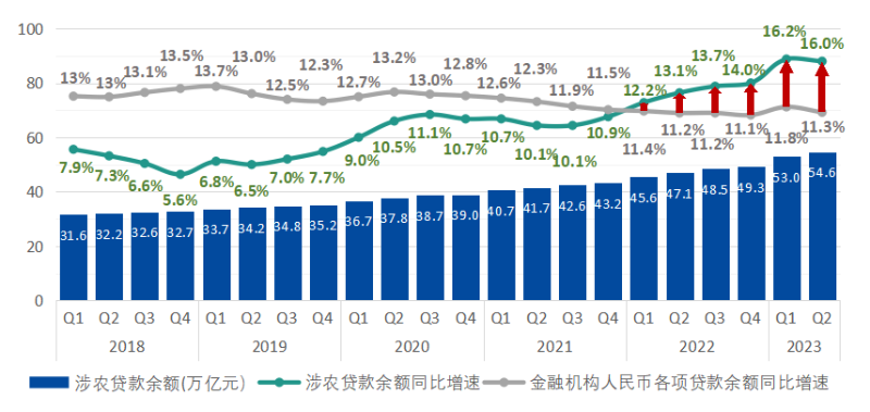 圖為2018-2023年二季度本外幣涉農(nóng)貸款余額變化趨勢(數(shù)據(jù)來源:中國人民銀行)