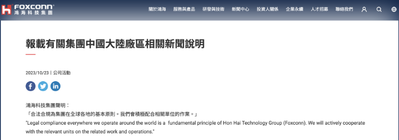 消息公布后,鴻海精密22日發(fā)布公告表示,合法合規(guī)為集團在全球各地的基本原則,會積極配合相關(guān)單位作業(yè),但并未多做進(jìn)一步的說明。