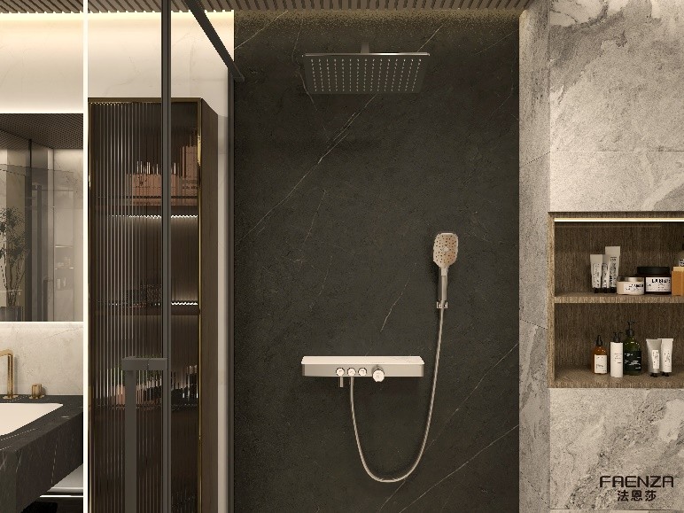 Solor花灑暗裝設(shè)計,僅露出巖板置物臺、龍頭開關(guān)與噴頭,節(jié)省空間同時明朗簡約,完美適配低奢格調(diào);內(nèi)置恒溫閥芯精準(zhǔn)溫控,每一次淋浴都是一場精密的溫度調(diào)配,讓舒適感官貫穿沐浴始終。