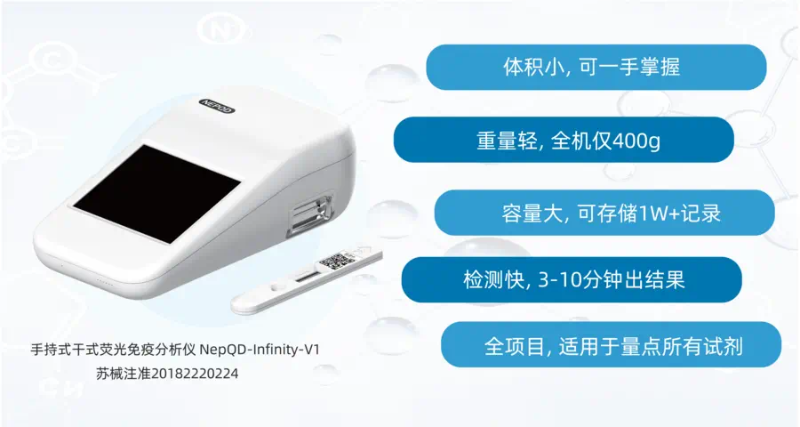 會場中,來自量點(diǎn)科技的產(chǎn)品受到了廣泛的關(guān)注。其中一款是全球首款可家用——手持式疫熒光分析儀NepQD-Infinity-v1。