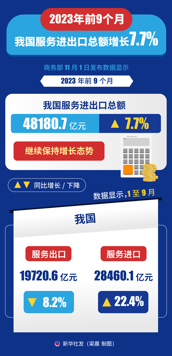 新華社北京11月1日電 商務(wù)部1日發(fā)布數(shù)據(jù)顯示,今年前9個月,我國服務(wù)進出口總額48180.7億元,同比增長7.7%,繼續(xù)保持增長態(tài)勢。