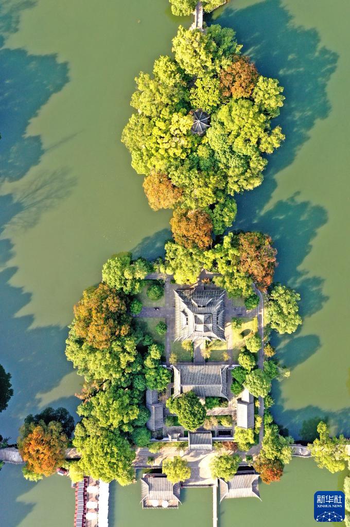 10月30日在浙江省臨海市東湖公園拍攝的秋景(無人機(jī)照片)。