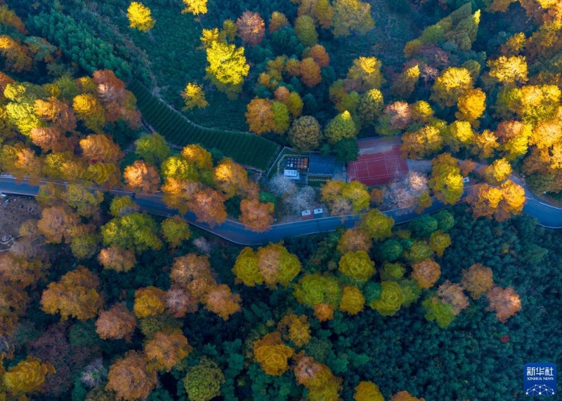 11月1日在浙江省湖州市安吉縣山川鄉(xiāng)九畝村金錢松公園拍攝的秋景(無人機(jī)照片)。