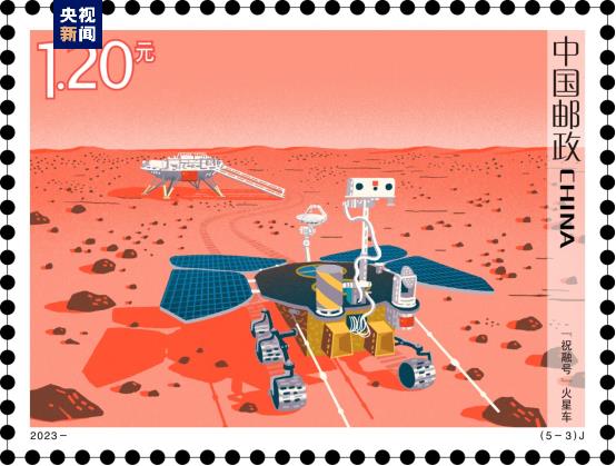 第三枚表現(xiàn)了“祝融號(hào)”火星車(chē)?!白H谔?hào)”火星車(chē)在世界上首次采用主動(dòng)懸架移動(dòng)系統(tǒng),可以很好適應(yīng)火星表面未知、復(fù)雜的地形環(huán)境,還具備良好的自主感知和自主管理能力。其搭載的六種科學(xué)載荷,獲取了大量科學(xué)數(shù)據(jù)和成果,深化了人們對(duì)火星的認(rèn)識(shí)。