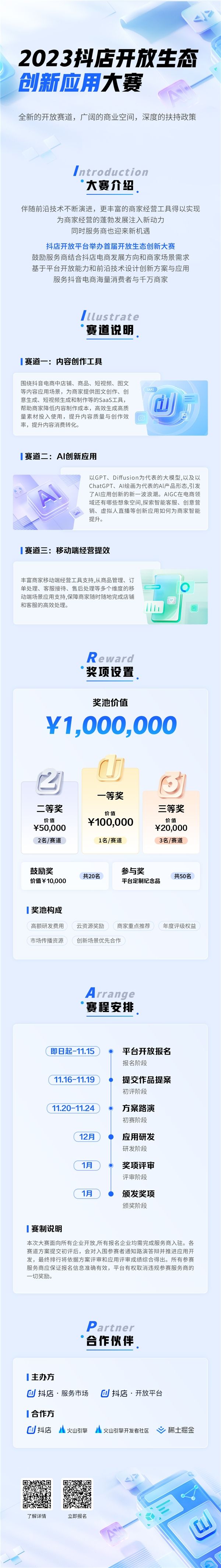 首屆抖店開放生態(tài)創(chuàng)新應用大賽特別開放了全新的「內(nèi)容創(chuàng)作工具」、「AI創(chuàng)新應用」、「移動端經(jīng)營提效」三大賽道,并設立了包含高額研發(fā)費用、云資源獎勵、年度評級權(quán)益等價值100萬元的獎池,扶持服務商成長。立即掃碼了解詳情、報名參賽,以技術(shù)創(chuàng)新驅(qū)動經(jīng)營能力提升!