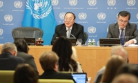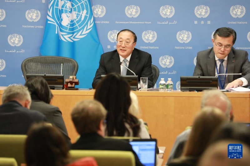 11月1日,在位于紐約的聯(lián)合國總部,中國常駐聯(lián)合國代表張軍(左)在媒體吹風(fēng)會上講話。