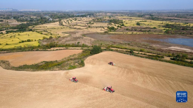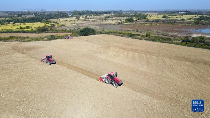 11月2日,在合肥市蜀山區(qū)小廟鎮(zhèn),農(nóng)民駕駛農(nóng)機(jī)在田間播種小麥(無人機(jī)照片)。