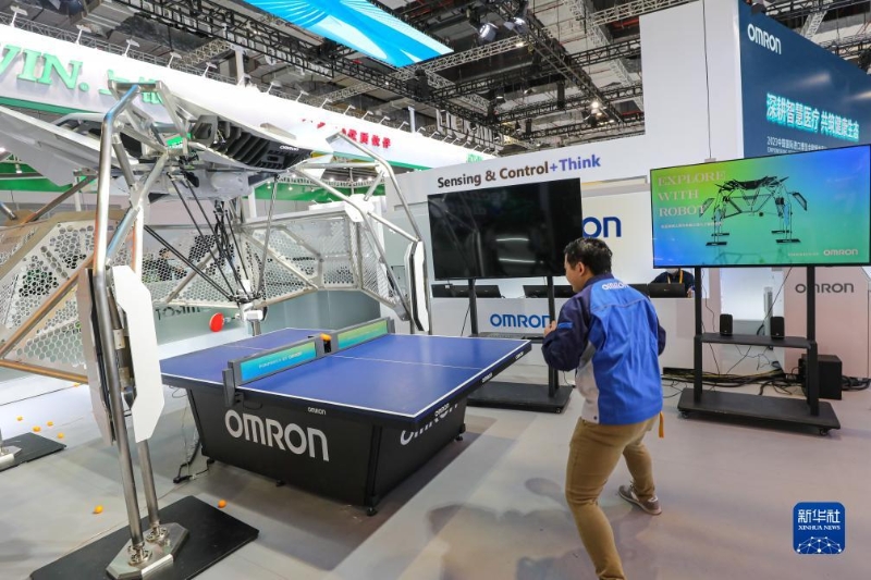 11月2日,工作人員在歐姆龍展位測試乒乓球教練機(jī)器人。