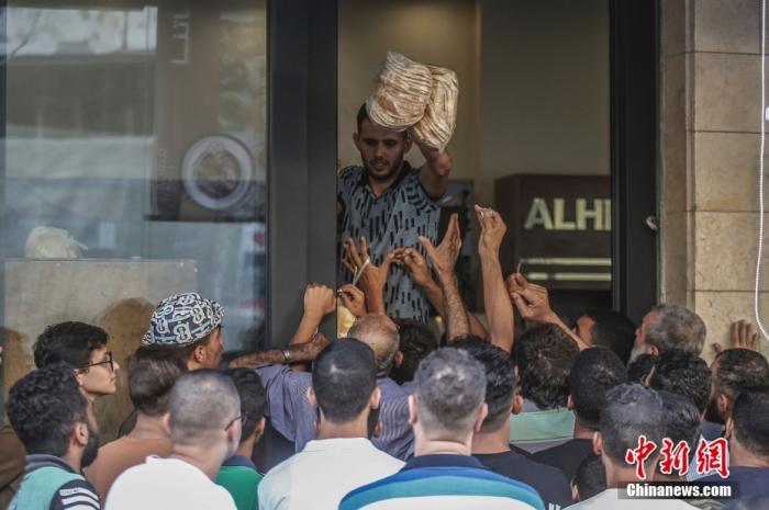 當(dāng)?shù)貢r(shí)間10月17日,加沙地帶南部城市汗尤尼斯,巴勒斯坦公民聚集在一家面包店前搶購(gòu)面包。