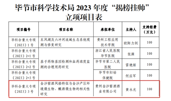 2021年,畢節(jié)市在貴州省9個州市中率先推行市級“揭榜掛帥”項目,三年來成功立項13項,其中一項是2023年由金沙酒業(yè)副總經(jīng)理鄒江鵬牽頭組織,金沙酒業(yè)技術(shù)研究院技術(shù)研發(fā)總監(jiān)楊明領(lǐng)銜負(fù)責(zé)的“金沙醬酒風(fēng)格特征與金沙產(chǎn)區(qū)環(huán)境微生物、釀酒微生物的相關(guān)性研究”,該項目獲批市級財政100萬元專項科研經(jīng)費立項支持。金沙酒業(yè)位于赤水河流域醬香白酒金沙產(chǎn)區(qū),在烏江和赤水河的雙重賦能下,具有得天獨厚的自然環(huán)境資源,充分發(fā)揮好金沙產(chǎn)區(qū)的獨特優(yōu)勢,開展金沙產(chǎn)區(qū)環(huán)境微生物和釀酒微生物、釀酒微生物代謝產(chǎn)物與風(fēng)味物質(zhì)形成、金沙產(chǎn)區(qū)醬香型白酒風(fēng)格特征等研究,具有重要科學(xué)意義和實際應(yīng)用價值,能為進一步擴大金沙產(chǎn)區(qū)白酒產(chǎn)能,凸顯質(zhì)量優(yōu)勢,提升金沙產(chǎn)區(qū)在中國白酒行業(yè)的定位和美譽度夯實基礎(chǔ),進而拉動地區(qū)工業(yè)經(jīng)濟高速增長。