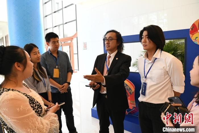 10月31日,參加兩岸媒體壯美廣西行活動的嘉賓們走進(jìn)香香花園,被園內(nèi)的香味和眾多展品吸引。圖為吳崇豪(左四)和吳育名(左五)接受記者采訪。中新社記者 蔣雪林 攝