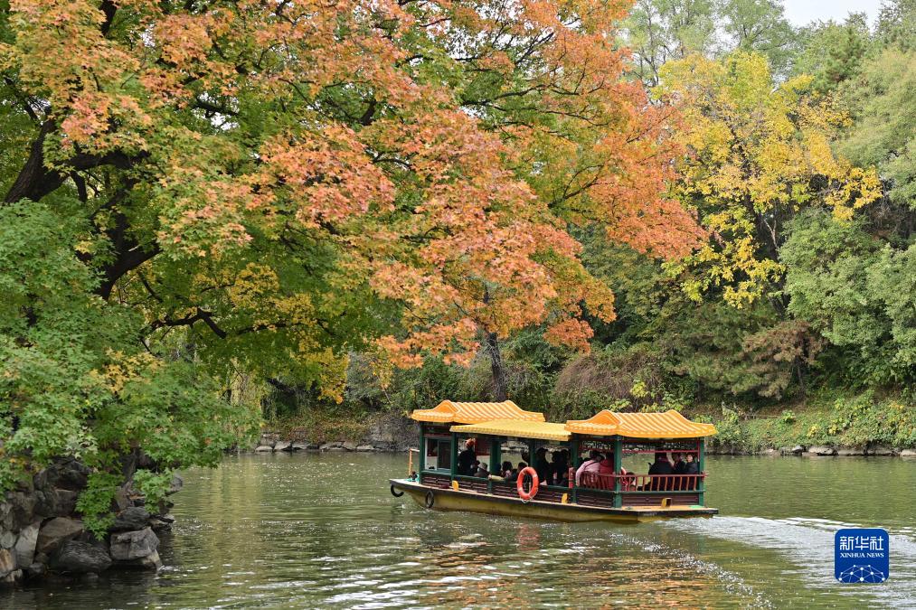 11月3日,游人在北京頤和園后湖乘船觀賞紅葉。