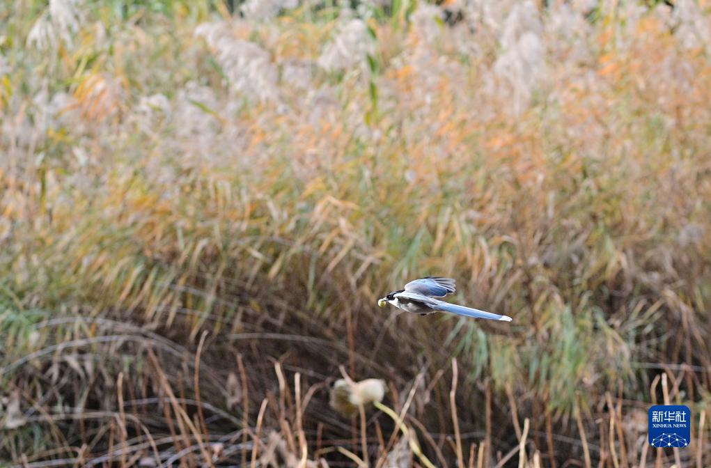 11月3日,一只灰喜鵲在北京頤和園耕織圖景區(qū)覓食。