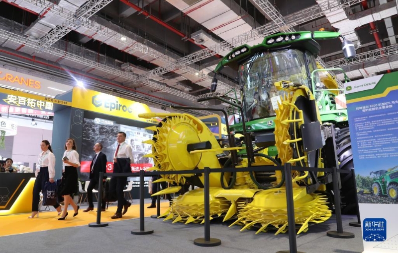 11月5日,參觀者在第六屆進(jìn)博會(huì)上經(jīng)過(guò)約翰迪爾公司推出的8600機(jī)型青貯收割機(jī)展品。