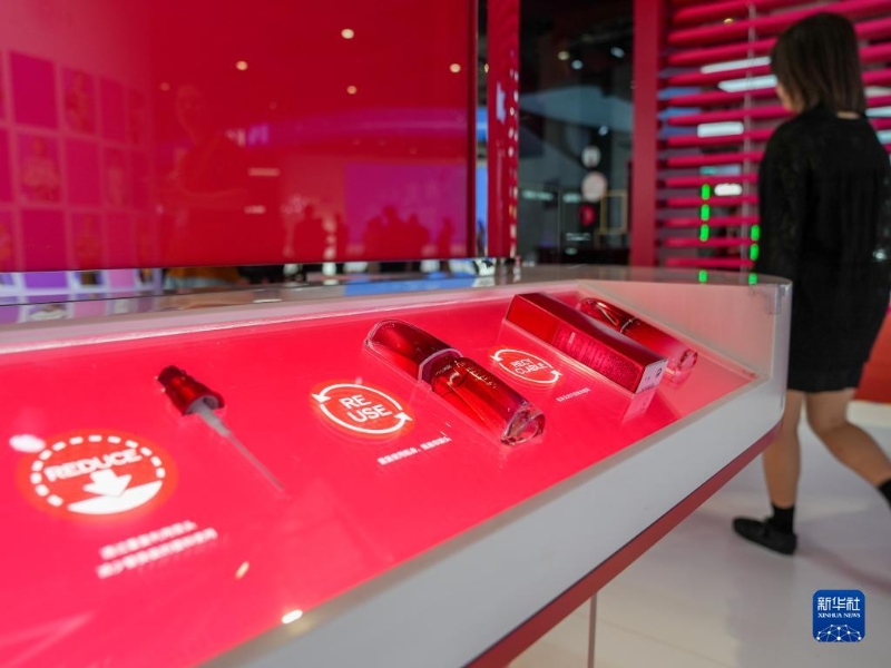 11月5日在第六屆進(jìn)博會(huì)消費(fèi)品展區(qū)資生堂展臺(tái)拍攝的紅腰子空瓶。資生堂在進(jìn)博會(huì)上首發(fā)首秀的“紅腰子空瓶再續(xù)計(jì)劃”,可讓化妝品空瓶實(shí)現(xiàn)100%循環(huán)使用。