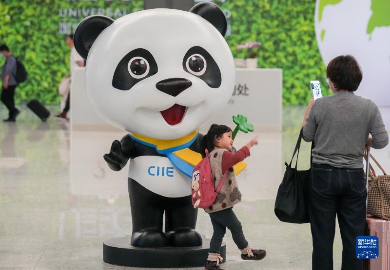 11月3日,旅客在上海虹橋機場2號航站樓內(nèi)與“進寶”合影。