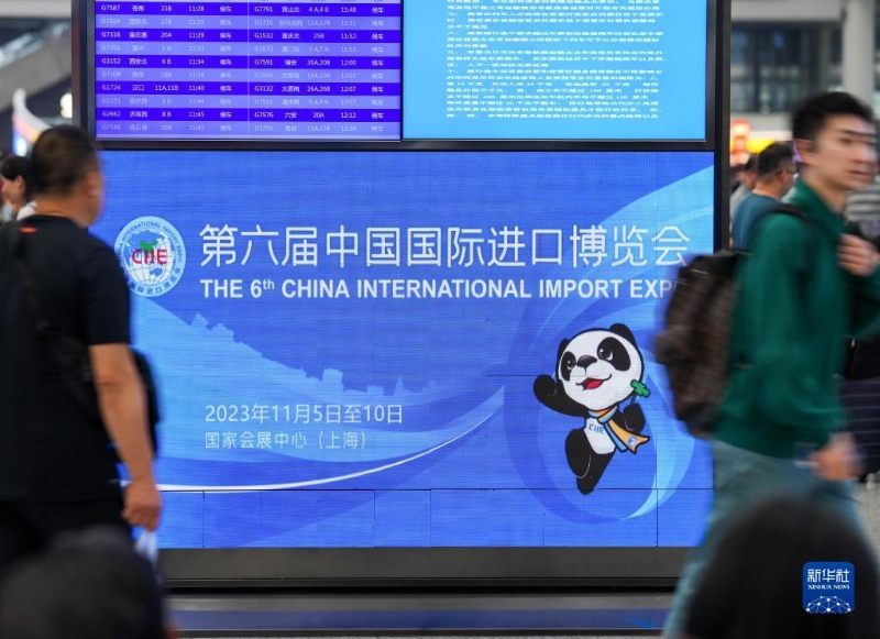 11月3日,旅客在上海虹橋火車站內(nèi)路過第六屆進博會海報。