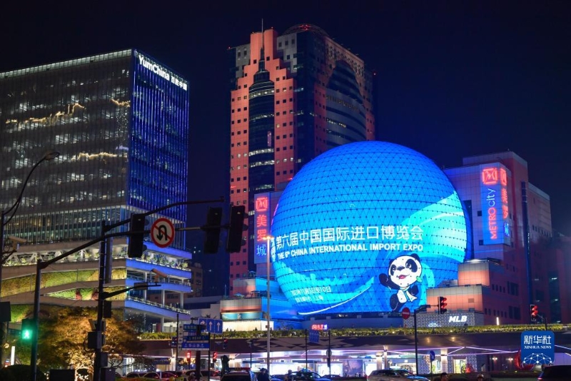 11月3日,上海徐匯區(qū)美羅城的巨型“水晶球”展示第六屆進博會海報。