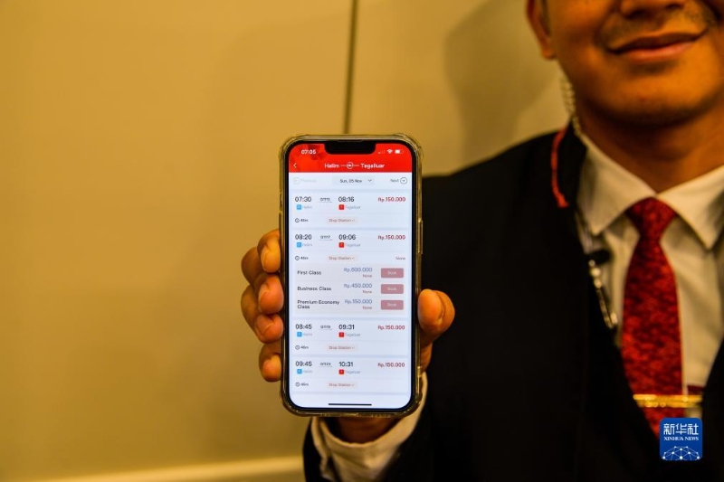11月5日,一名乘務(wù)人員在行駛中的雅萬高鐵高速動(dòng)車組列車車廂內(nèi)展示雅萬高鐵購票手機(jī)應(yīng)用,當(dāng)日部分車次車票已售罄。