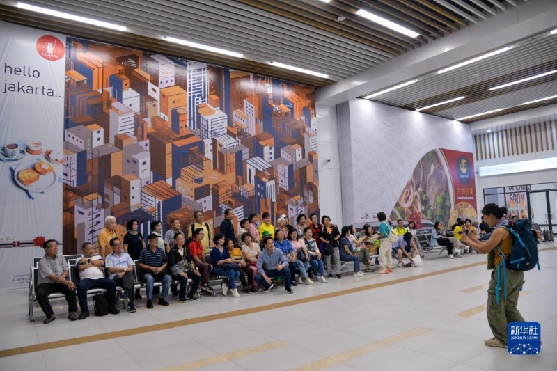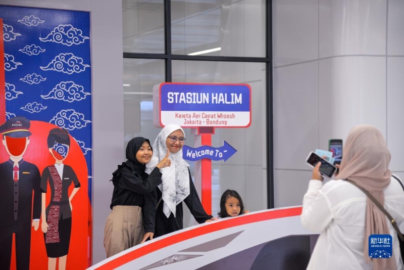 11月5日,在印度尼西亞雅加達(dá)哈利姆站候車大廳,人們和一個(gè)雅萬高鐵高速動(dòng)車組模型合影。