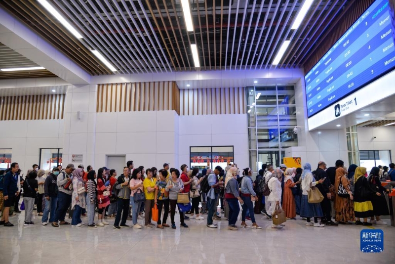 11月5日早,在印度尼西亞雅加達(dá)哈利姆站候車大廳,人們排隊(duì)準(zhǔn)備前往站臺(tái)乘坐當(dāng)日第一班高鐵。