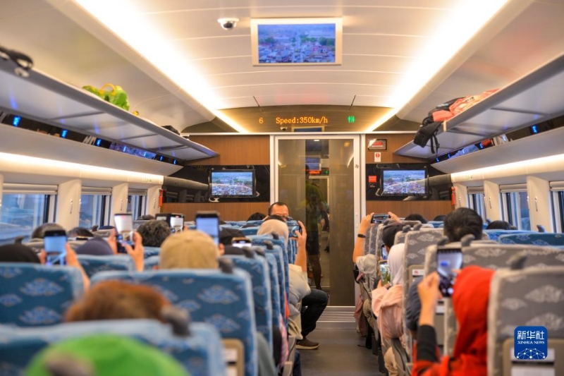 11月5日,乘客紛紛用手機(jī)在行駛中的雅萬高鐵高速動(dòng)車組列車車廂內(nèi)拍攝顯示列車時(shí)速達(dá)到350公里的電子屏。