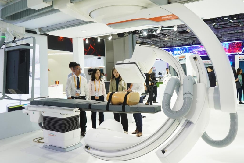 11月5日,在第六屆進博會醫(yī)療器械及醫(yī)藥保健展區(qū)西門子展臺拍攝的全球首款量子能譜血管造影系統(tǒng)。新華社記者 金皓原 攝