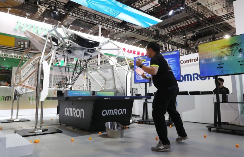 11月5日,工作人員(右)在第六屆進博會上展示歐姆龍公司展出的第八代FORPHEUS乒乓球教練機器人。新華社記者 方喆 攝